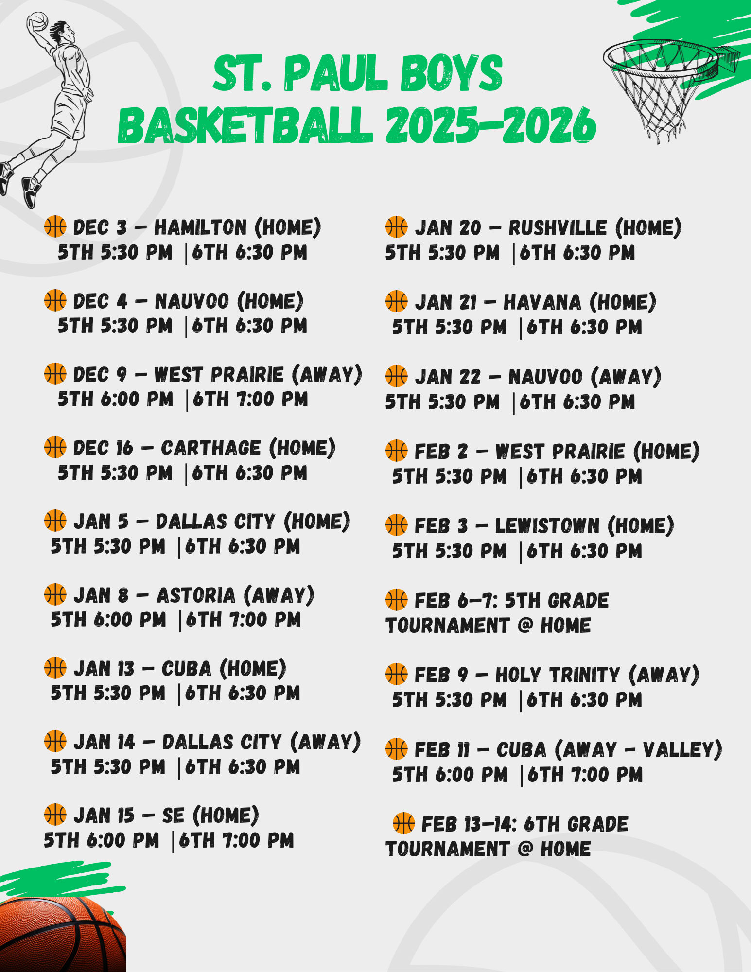 Saint Paul School Extra-Curricular 5th & 6th Grade Sports 2025-2026 Basketball Schedules Girls Basketball Schedule Boys Basketball Schedule 2025-2026 Volleyball Schedule Girls Volleyball Schedule